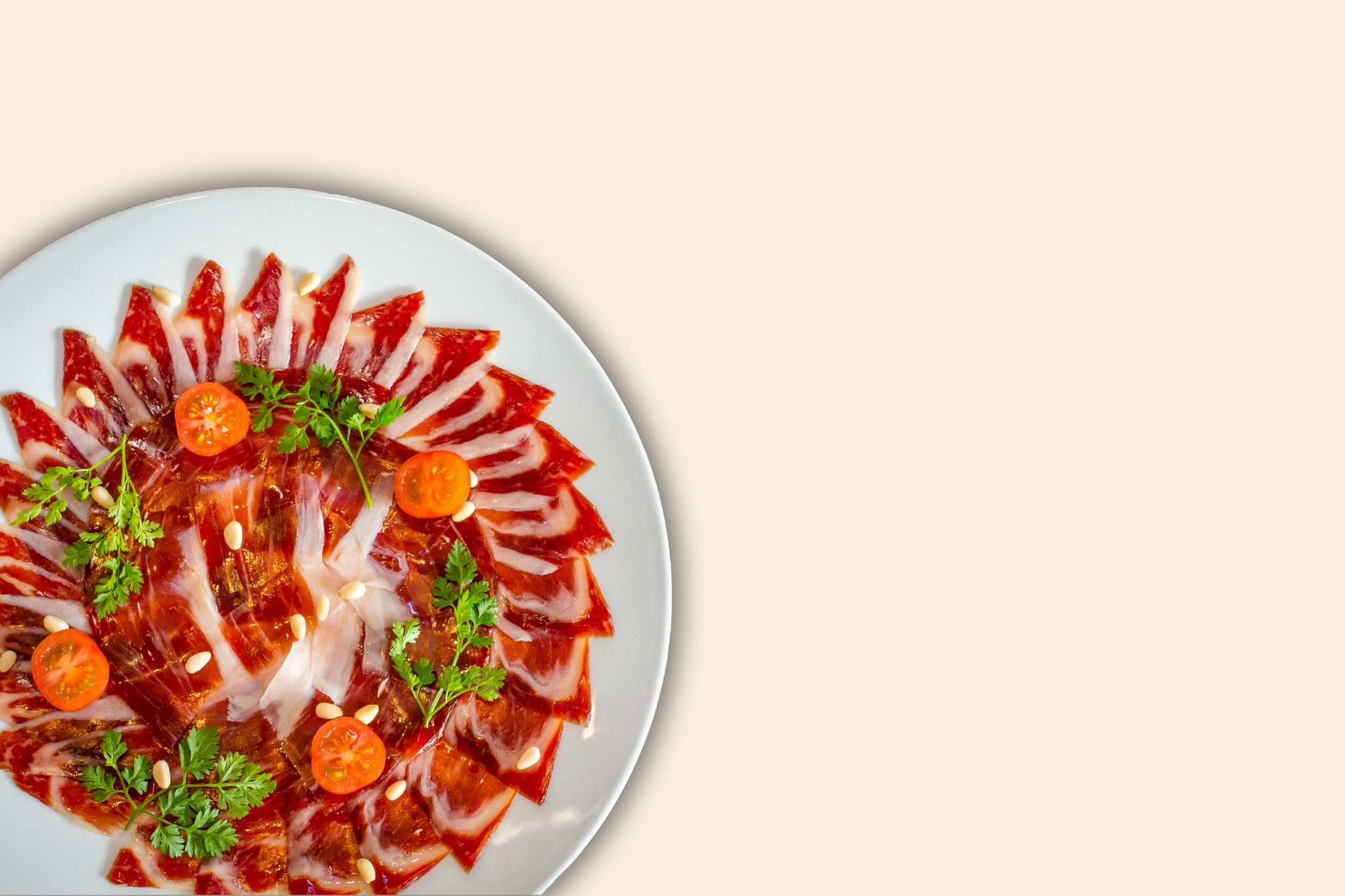 Jamón Bellota 50% Ibérico: 50–75% Ibérico-ras, vrije uitloop in de dehesa, gevoed met eikels en natuurlijke grassen, 36+ maanden gerijpt.